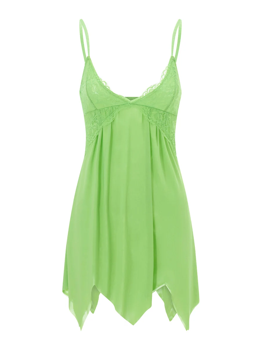 Women Lace Nightdress Lingerie Mesh See-Through V-Neck Sleeveless Sling Sleepwear Dress Irregular Hem Backless Underwear