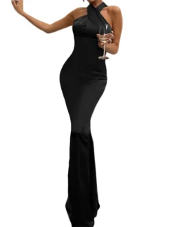 Women Solid Color Long Dress, Cross Halter Backless Ball Gown Cocktail Party Evening Dresses