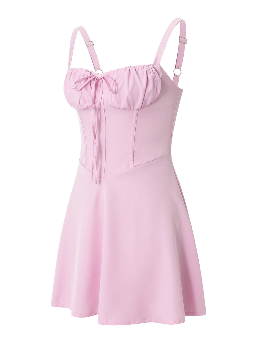 Women Summer Casual Sling Dress Solid Color Tie-Up Fishbone Waist Shaping Sleeveless Backless Short Dress Fashion Party Dress